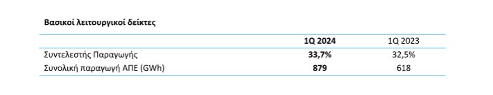 Όσον αφορά στο συντελεστή φόρτισης (load factor), αυτός διαμορφώθηκε σε 33,7% για το σύνολο του χαρτοφυλακίου κατά το πρώτο τρίμηνο του έτους, έναντι 32,5% για το πρώτο τρίμηνο του 2023, ενώ συγκεκριμένα για την Ελλάδα διαμορφώθηκε σε 33,3% έναντι 31,9%. Σε συνδυασμό με την αυξημένη εγκατεστημένη ισχύ, η παραγωγή ενέργειας αυξήθηκε κατά 42,2% και ανήλθε στις 879 GWh. Σημειώνεται ότι εξαιρώντας το έργο του Καφηρέα, η παραγωγή ενέργειας αυξήθηκε κατά 6,2%.