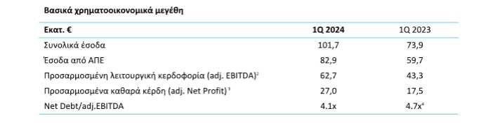 Σημαντική αύξηση παρουσίασαν τα έσοδα (+37,6%) και η καθαρή κερδοφορία (+54,3%) κατά το πρώτο τρίμηνο του έτους σε συνέχεια της αυξημένης εγκατεστημένης ισχύος και της ομαλοποίησης των ανεμολογικών συνθηκών, έναντι της αντίστοιχης περιόδου του προηγούμενου έτους. Επίσης, σε συνέχεια της αύξησης της λειτουργικής κερδοφορίας ο συντελεστής μόχλευσης (Net debt/adj.EBITDA) μειώθηκε στο τέλος του Α’ τριμήνου του 2024 σε 4.1x από 4.7x κατά το τέλος του 2023.