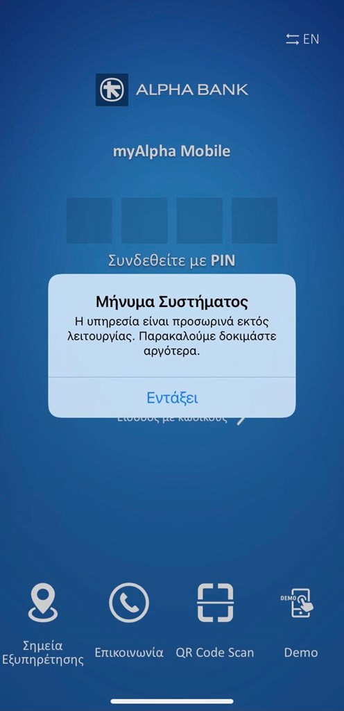 Προσωρινά μη διαθέσιμες βρέθηκαν οι υπηρεσίες Web-banking της Alpha Bank. Το σύστημα εμφάνισε πρόβλημα τουλάχιστον για μερίδα πελατών της τράπεζας. Ωστόσο, με την παρέλευση λίγης ώρας επανήλθε σε κανονική λειτουργία.