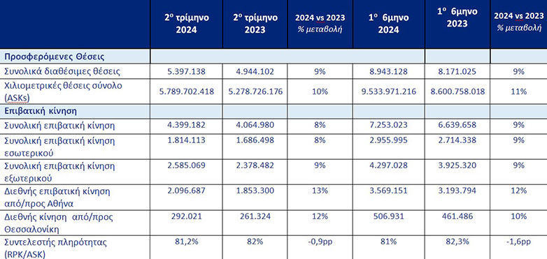 Συνολικά 4,4 εκατ. επιβάτες μετέφερε η AEGEAN κατά το 2ο τρίμηνο 2024, καταγράφοντας αύξηση 8% στην επιβατική κίνηση και φτάνοντας τους 7,3 εκατομμύρια επιβάτες κατά το 1ο εξάμηνο του έτους, σημειώνοντας 9% αύξηση συγκριτικά με την προηγούμενη χρονιά. Μόνο κατά το 2ο τριμήνου του έτους η AEGEAN προσέφερε 5,4 εκατ. θέσεις, 9% περισσότερες από το 2023, ενώ για το σύνολο του έτους θα προσφέρει περισσότερες από 19,8 εκατ. θέσεις, περίπου 6% περισσότερες από πέρυσι.