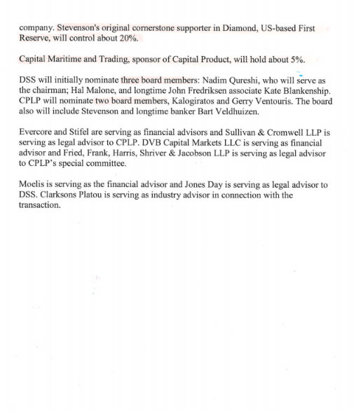 Επί της ουσίας δηλαδή, όπως προκύπτει αβίαστα από το περιεχόμενο της συμφωνίας, η Diamond S εξαγόρασε μέσω συγχωνεύσεως την Capital Product Partners, η οποία ήταν εισηγμένη, προκειμένου να τη χρησιμοποιήσει ως «όχημα» για να εισέλθει στο Χρηματιστήριο, που ήταν και ο αρχικός στόχος.