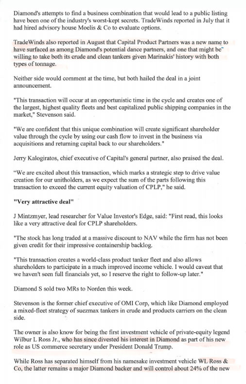 Η ναυτιλιακή εταιρεία Diamond S συμφερόντων της οικογενείας Wilbur Ross, του υπουργού Εμπορίου των ΗΠΑ, συγχωνεύτηκε με την Capital Product Partners, στην οποία ο Βαγγέλης Μαρινάκης διατηρούσε ένα 16% του μετοχικού της κεφαλαίου. Αλλά η συγχώνευση αυτή κρύβει μία ενδιαφέρουσα προϊστορία.