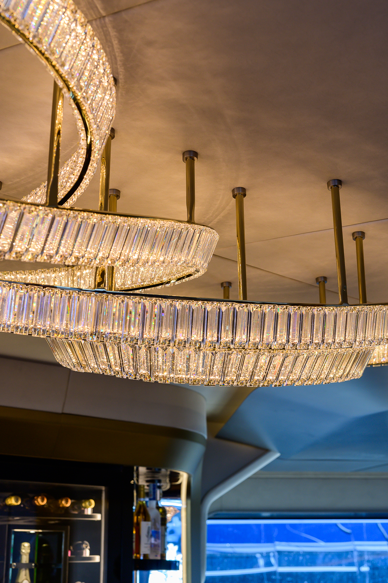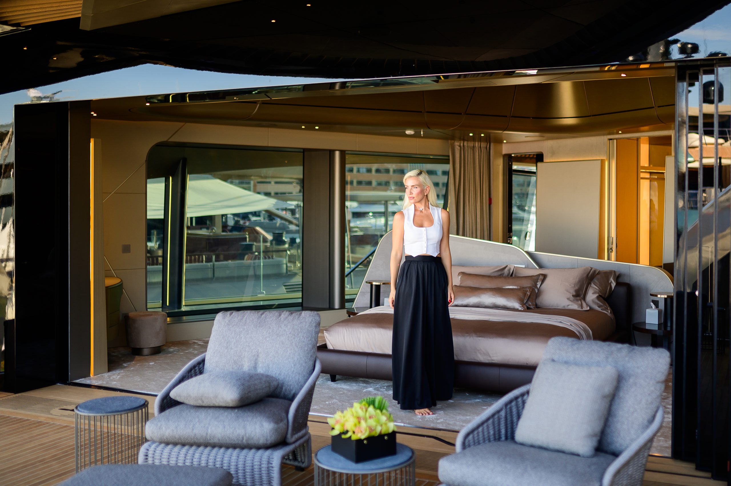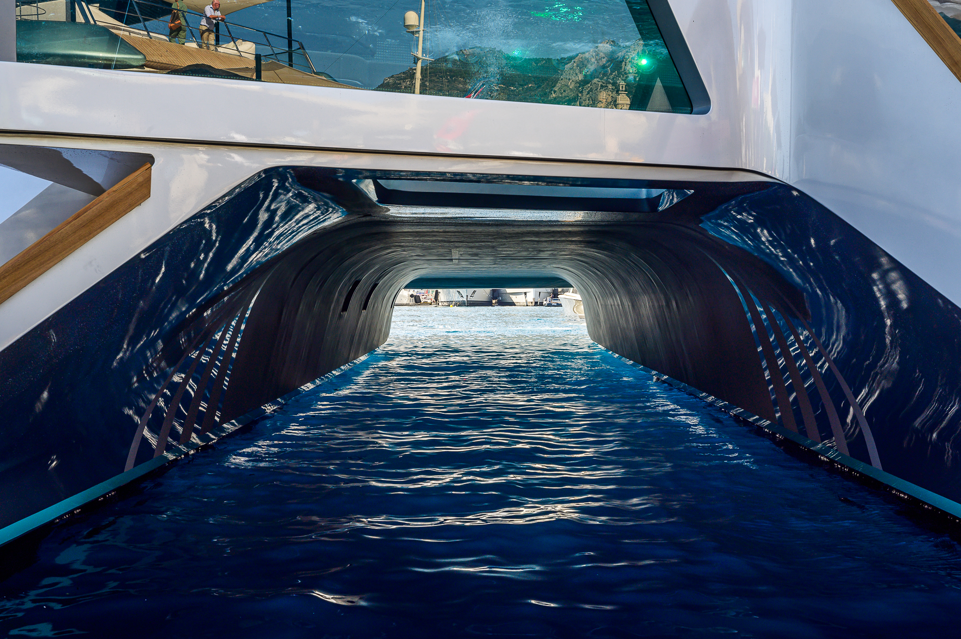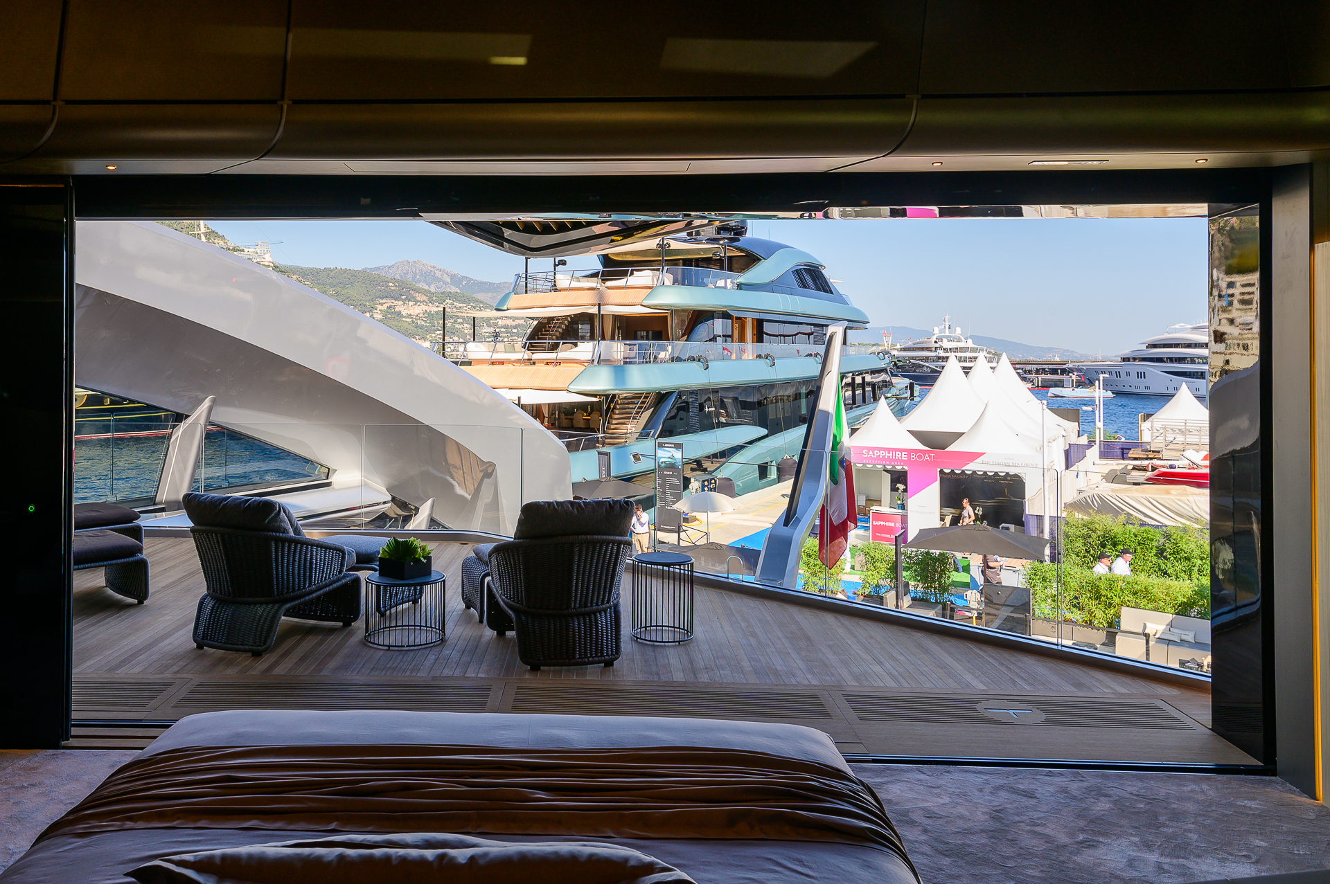 Το λαμπερό yacht είναι καλυμμένο με γυαλί σε όλο το μήκος του και η master καμπίνα του φτάνει στα 3,3 μέτρα.