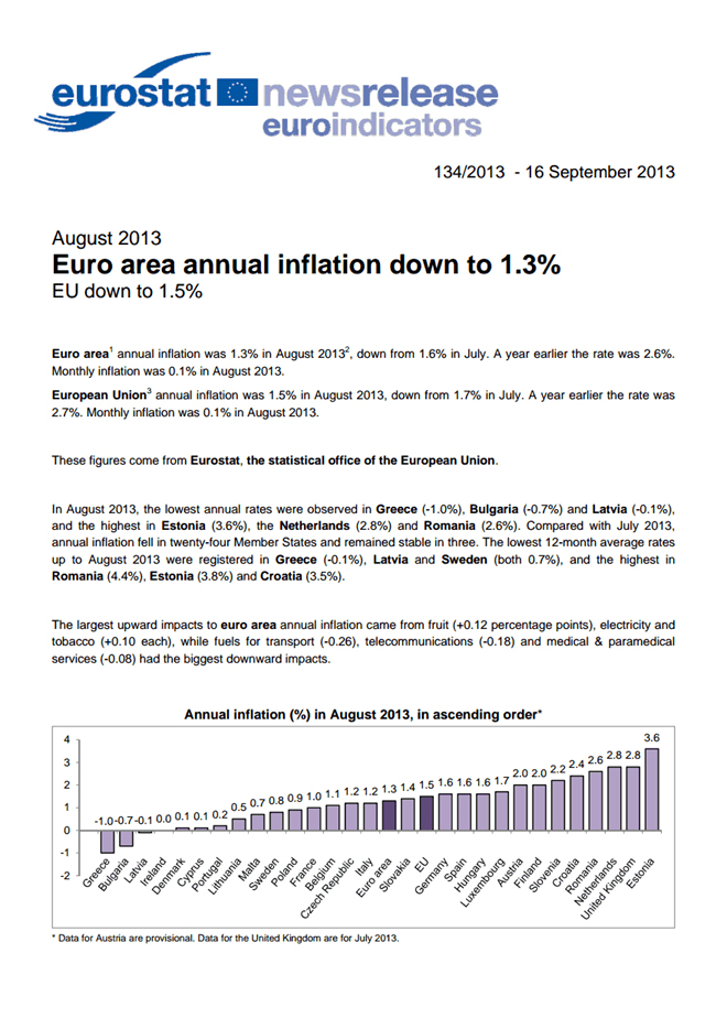 Στην Ευρωζώνη, ο πληθωρισμός μειώθηκε στο 1,3% τον Αύγουστο από 1,6% τον Ιούλιο, ενώ πριν από έναν χρόνο ήταν στο 2,6%. Στην Ε.Ε. ο πληθωρισμός μειώθηκε στο 1,5% από 1,7% την ίδια περίοδο, ενώ πέρυσι βρισκόταν στο 2,7%.