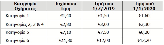 Αντίστοιχα, αυξήσεις θα ισχύσουν και στα εκπτωτικά προγράμματα, με τις νέες τιμές για κάθε εκπτωτικό πρόγραμμα και κατηγορία οχήματος να ανακοινώνονται στους χρήστες σε εύλογο χρονικό διάστημα προ της εφαρμογής τους.