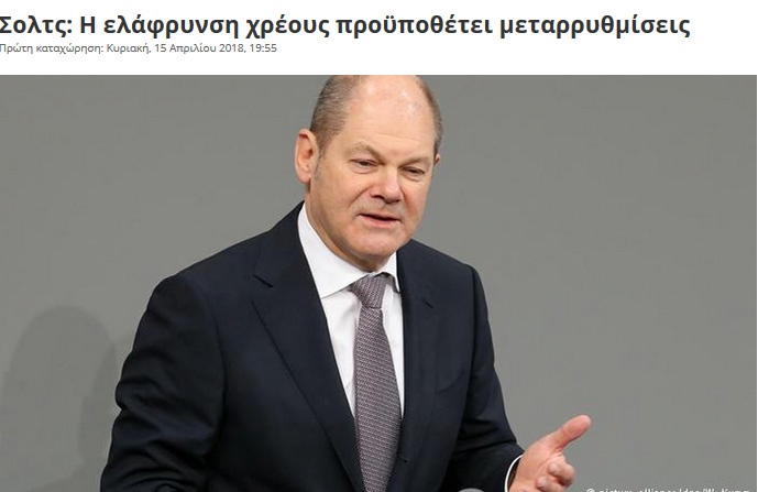 Όσον αφορά στη στάση του Βερολίνου, ο νέος ΥΠΟΙΚ Όλαφ Σολτς σε συνέντευξή του στη «FAS» επέμεινε στην πάγια θέση ότι μέχρι το καλοκαίρι αναμένεται το τελικό πόρισμα των θεσμών για την υλοποίηση των προαπαιτούμενων του τρέχοντος ελληνικού προγράμματος, όπως και η αξιολόγηση της βιωσιμότητας του χρέους.