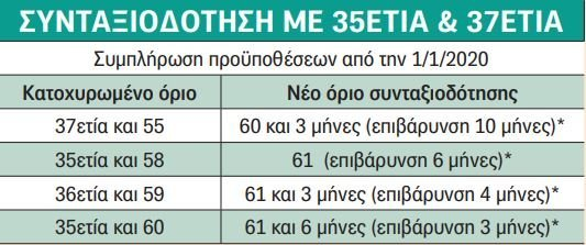 Νέες αλλαγές στα όρια ηλικίας χιλιάδων ασφαλισµένων έρχονται από 1ης Ιανουαρίου 2020, στο πλαίσιο της µεγάλης µεταβατικής περιόδου που ξεκίνησε το 2015 και ολοκληρώνεται το 2022. Μοναδική κατηγορία ασφαλισµένων που µένουν ανεπηρέαστοι από τη νέα αύξηση είναι όσοι είχαν οριστικά θεµελιώσει δικαίωµα τη 19η Αυγούστου 2015, είχαν δηλαδή συµπληρώσει τότε και τις δύο προϋποθέσεις: το όριο ηλικίας και τον απαιτούµενο χρόνο ασφάλισης. Επιπρόσθετα, δεν επηρεάζεται η δυνατότητα συνταξιοδότησης όσων αποχωρούν µε βαρέα και ανθυγιεινά. Αντίθετα, η νέα αύξηση ορίων που έρχεται από 1/1/2020 επηρεάζει την ηλικία συνταξιοδότησης για όλους όσοι έχουν κατοχυρωµένο δικαίωμα σύνταξης µε τα παλαιά όρια και µπορούν να αποχωρήσουν νωρίτερα από τα 62 ή τα 67 µέχρι και 31/12/2022. Τα νέα όρια αφορούν κυρίως συνταξιοδοτούµενους µε 35ετία και 37ετία, γονείς στο ∆ηµόσιο ή το ΙΚΑ κ.ά. Η αύξηση κυµαίνεται από 3 µήνες για τις 35ετίες έως 21 µήνες, δηλαδή 1,9 χρόνια για όλες τις υπόλοιπες περιπτώσεις.