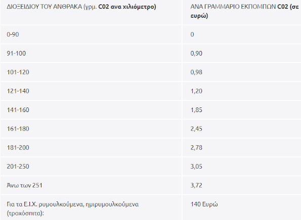 Λαμβάνονται υπ’ όψιν οι εκπομπές διοξειδίου του άνθρακα, όπως αυτές αναγράφονται στην άδεια του οχήματος, ως εξής: