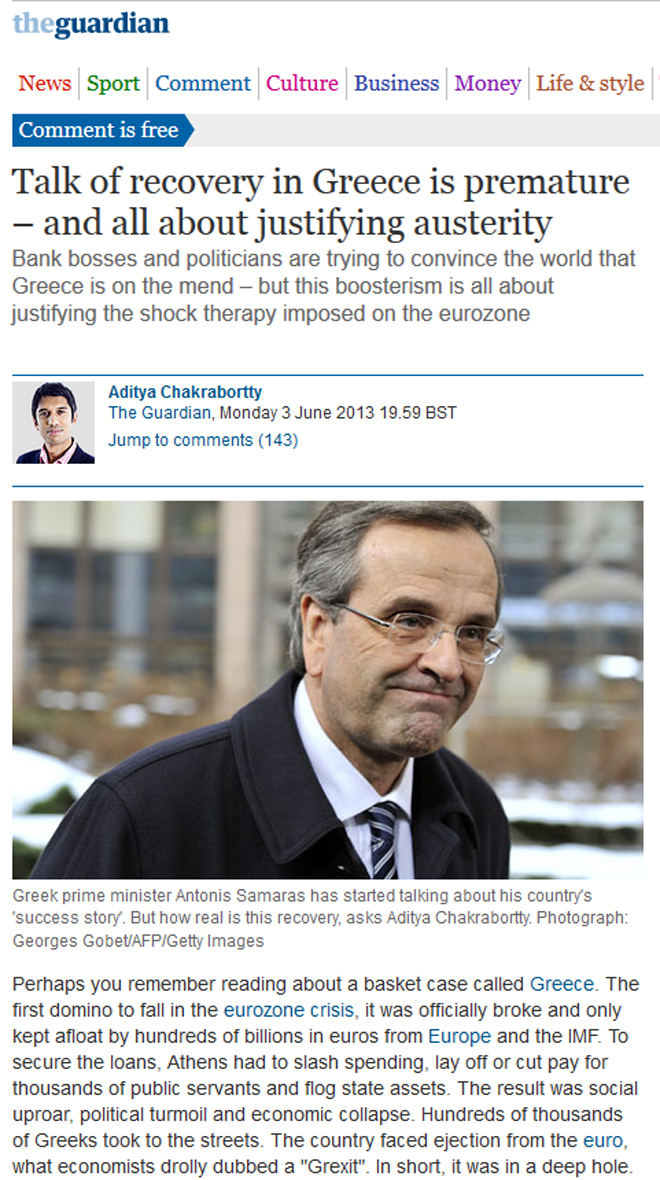 «Εδώ και μερικές εβδομάδες ανώτεροι αξιωματούχοι της Αθήνας προσπαθούν να πείσουν τον κόσμο ότι ήρθαν και πάλι οι ευτυχισμένες μέρες. Ο Αντώνης Σαμαράς κάνει πλέον λόγο για το ελληνικό success story» γράφει ο Aditya Chakrabortty που υπογράφει το άρθρο, προσθέτοντας: «Το αφεντικό της κεντρικής τράπεζας υποστηρίζει πως η Ελλάδα έχει επανέλθει στον σωστό δρόμο. Ο ελληνικός Τύπος και μέρος του διεθνούς γνέφουν καταφατικά, ενώ οι κάτοχοι ελληνικών ή ευρωπαϊκών επενδυτικών αγαθών επικροτούν: ξεχάστε το Grexit και καλωσορίστε την Greecovery».