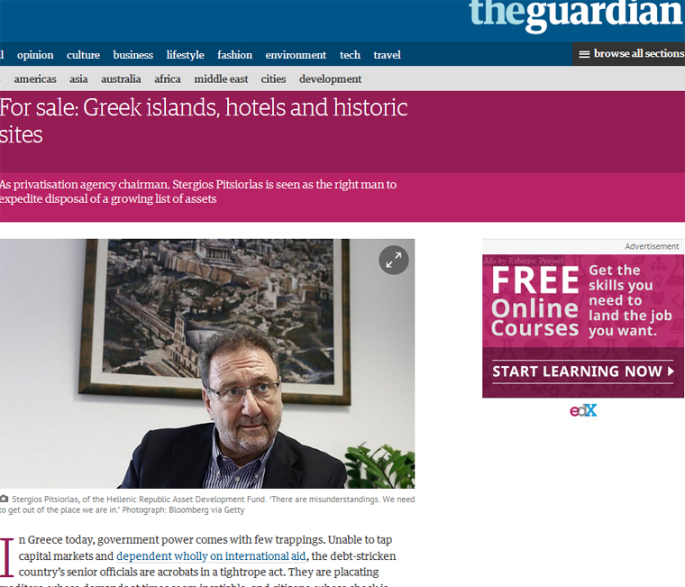 Μιλώντας στην «Guardian» ο επικεφαλής του ΤΑΙΠΕΔ υποστηρίζει πως «αν και κατά κάποιους τρόπους οι επικριτές έχουν δίκιο, η αλήθεια βρίσκεται κάπου στη μέση»Το δημοσίευμα τιτλοφορείται «Πωλούνται: ελληνικά νησιά, ξενοδοχεία και ιστορικές τοποθεσίες» και σ’ αυτό γίνεται λόγος για 71.000 «φιλέτα» κρατικής περιουσίας που θα μεταφερθούν στο Υπερταμείο Αποκρατικοποιήσεων, στο πλαίσιο του μεγαλύτερου σύγχρονου προγράμματος ιδιωτικοποιήσεων στην ευρωπαϊκή ήπειρο.