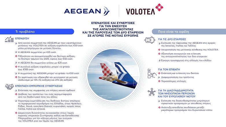 -την άμεση συμμετοχή της AEGEAN με 25 εκατομμύρια ευρώ, σε αύξηση κεφαλαίου, μαζί με τους υφιστάμενους μετόχους της Volotea με δάνειο μετατρέψιμο σε μετοχές συνολικού ύψους έως 50 εκατ. ευρώ. Στόχος η ενίσχυση της αναπτυξιακής δυναμικής της Volotea. H συμφωνία προβλέπει, και τη δυνατότητα, υπό προϋποθέσεις, μια δεύτερης δόσης στην αύξηση κεφαλαίου της Volotea, και πάλι με μετατρέψιμο δάνειο, κατά το 1ο εξάμηνο του 2025, για ακόμη, έως 50 εκατ. ευρώ, και πάλι από κοινού με τους υφιστάμενους μετόχους της Volotea, στην οποία εφόσον λάβει χώρα θα συμμετέχει και η AEGEAN με 25 επιπλέον εκατομμύρια. To σύνολο των αυξήσεων κεφαλαίου με το μετατρέψιμο δάνειο μπορεί τελικά να φτάσει έως τις 30/6/2026 στα 100 εκατ. για την VOLOTEA στα oποία η AEGEAN θα έχει συμβάλει συνολικά 50 εκατ.ευρώ.