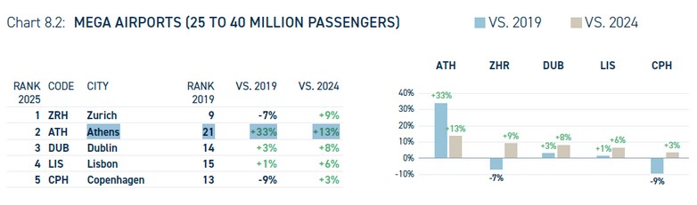 Παράλληλα, επιτυγχάνοντας σημαντικό άλμα ανάπτυξης μετά την πανδημική περίοδο, ο Διεθνής Αερολιμένας Αθηνών (+33% vs. 2019, +13% vs. 2024) ξεπέρασε τις επιδόσεις των περισσότερων ευρωπαϊκών αεροδρομίων (Mega Airports – κίνηση 25-40 εκ. επιβάτες), ενώ, σύμφωνα με τη Eurostat, καταγράφοντας την υψηλότερη αύξηση έναντι του 2019 μεταξύ των ευρωπαϊκών αεροδρομίων, κατέλαβε την 8η θέση στην Ευρωπαϊκή Ένωση σε κινήσεις αεροσκαφών.