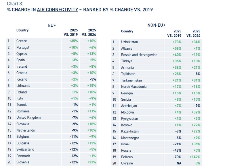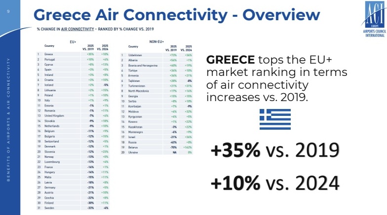 Ωστόσο, η κορυφαία κατάταξη στις κατηγορίες τους, τόσο της Ελλάδας όσο και του αεροδρομίου της Αθήνας, καταδεικνύει την εντυπωσιακή ανάκαμψη και ανάπτυξη τόσο των τουριστικών μεγεθών όσο και της αεροπορικής δραστηριότητας στη χώρα μας και στην αγορά της Αθήνας: Καταγράφοντας τις υψηλότερες επιδόσεις (+35% vs. 2019, +10% vs. 2024) μεταξύ των 31 κρατών μελών της ΕΕ (EU+), η Ελλάδα κατατάσσεται στην πρώτη θέση της ευρωπαϊκής διασυνδεσιμότητας στο σύνολό της (άμεση & έμμεση).