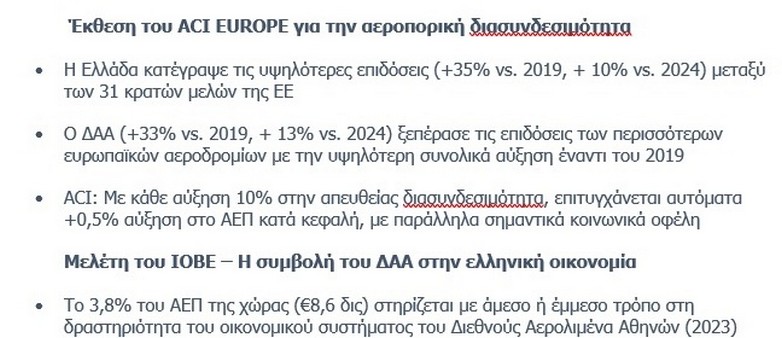 Όπως αναφέρει στη σχετική Έκθεση και το ACI EUROPE, με κάθε αύξηση 10% στην απευθείας διασυνδεσιμότητα επιτυγχάνεται αυτόματα +0,5% αύξηση στο AEΠ κατά κεφαλή, με σημαντικά κοινωνικά οφέλη (μείωση δείκτη της φτώχειας, αύξηση δεικτών πρόσβασης στην εκπαίδευση, γενικότερη ευημερία, κ.α.) γεγονός που αναδεικνύει τις ιδιαίτερα θετικές κοινωνικο-οικονομικές επιπτώσεις της ανάπτυξης των αερομεταφορών στις εθνικές και τοπικές οικονομίες.
