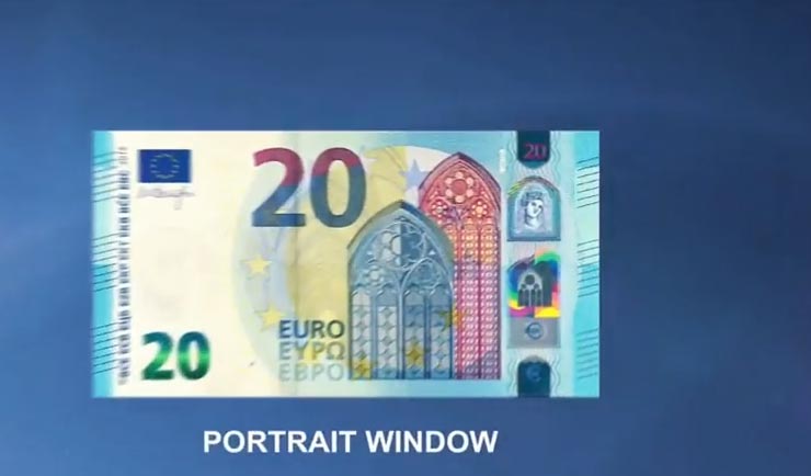 Το νέο τραπεζογραμμάτιο περιλαμβάνει ένα καινοτόμο χαρακτηριστικό ασφαλείας, το «παράθυρο με προσωπογραφία» στο ολόγραμμα. Όταν το τραπεζογραμμάτιο παρατηρείται στο φως, το παράθυρο γίνεται διαφανές και αποκαλύπτει μια προσωπογραφία της Ευρώπης, μιας μορφής της μυθολογίας, η οποία είναι ορατή και στις δύο όψεις του τραπεζογραμματίου.