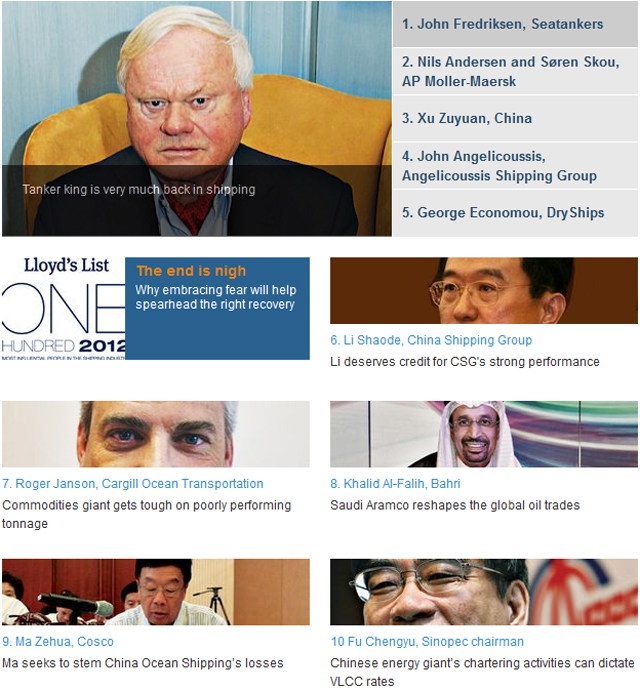 Στο Top 100 τη Lloyd’s List με τους επιχειρηματίες που πρωταγωνίστησαν το 2012 συναντούμε 14 Έλληνες εφοπλιστές.