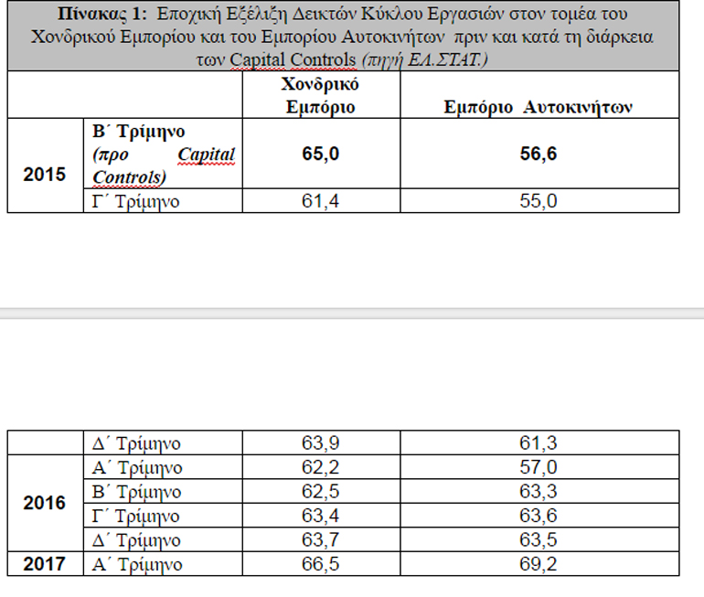 Η σύγκριση των δωδεκάμηνων Ιουλίου 2014 – Ιουνίου 2015 / Ιουλίου 2015 -Ιουνίου 2016 (μέσοι όροι δεικτών δωδεκαμήνου), περίοδος κατά την οποία η επίδραση των κεφαλαιακών περιορισμών – Capital Controls – έγινε περισσότερο απτή, καταδεικνύει μία πτώση του ΔΚΕ στο Λιανικό Εμπόριο κατά 4,9%, ενώ η μείωση του Δείκτη Όγκου κυμάνθηκε στα επίπεδα του 3,3%. Η παρατηρούμενη βελτίωση του τελευταίου εννιαμήνου (Ιούλιος 2016-Μάρτιος 2017: τελευταία διαθέσιμα στοιχεία), επιβεβαιώνει την άποψη πως στη διάρκεια των πρώτων 12 μηνών από την επιβολή των Capital Controls η ένταση των αρνητικών επιπτώσεων στο τζίρο των επιχειρήσεων έφτασε στο αποκορύφωμά της.