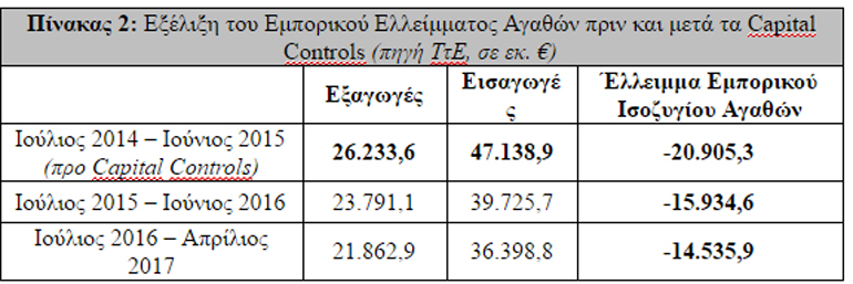 Η συρρίκνωση του εμπορικού ελλείμματος αγαθών κατά 4,97 δις € κατά τη διάρκεια του 1ου έτους επιβολής των Capital Controls (Ιούλιος 2014-Ιούνιος 2015 / Ιούλιος 2015 – Ιούνιος 2016), βασίζεται αποκλειστικά και μόνο στη δραματική μείωση των Εισαγωγών (-7,41 δις €), από τη στιγμή που η εξαγωγική δραστηριότητα υποχώρησε κατά 2,44 δις €. Στη διάρκεια του τελευταίου δεκαμήνου (Ιούλιος 2016 – Απρίλιος 2017), καταγράφεται βελτίωση σε σχέση με το αντίστοιχο δεκάμηνο Ιουλίου 2015 – Απριλίου 2016, όσον αφορά στις Εξαγωγές κατά 2,12 δις €. Μπορεί βεβαίως να παρατηρείται και ταυτόχρονη άνοδος των Εισαγωγών κατά 3,51 δις €, η συγκεκριμένη όμως εξέλιξη αποδίδεται στην αποκατάσταση σε μεγάλο βαθμό των όρων λειτουργίας και ρευστότητας της Αγοράς.