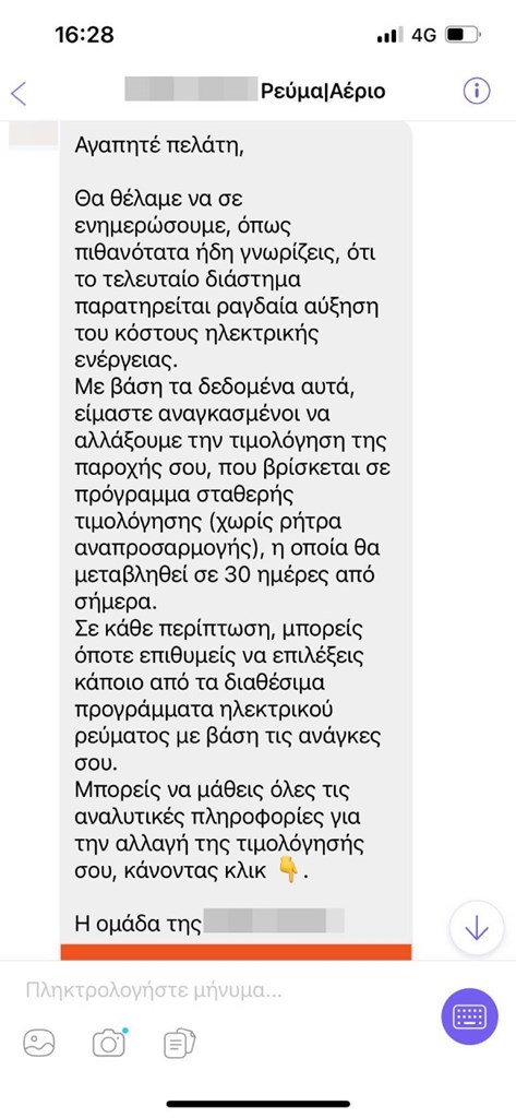 Αυτό έχει ως συνέπεια, ακόμα και οι καταναλωτές που είχαν σκεφτεί πιο έξυπνα και είχαν επιλέξει σταθερά τιμολόγια, να δαγκώνουν, θέλουν δεν θέλουν και αυτοί το αγκίστρι, όπως αποδεικνύει και το μήνυμα που έλαβε από τον πάροχό του και μας προώθησε αναγνώστης της «Ζούγκλας».