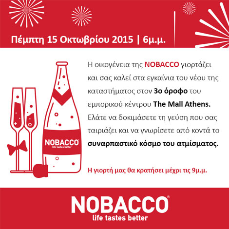 Τα εγκαίνια για το νέο κατάστημα στο Mall στο Μαρούσι, κάνει η NOBACCO, η μεγαλύτερη εταιρεία ηλεκτρονικού τσιγάρου, στην Ελλάδα. Την Πέμπτη 15 Οκτωβρίου στις 6μμ, ατμιστές από όλη την Αθήνα θα έχουν την ευκαιρία να πάρουν μέρος σε μία ιδιαίτερη γιορτή, και να απολαύσουν τα μοναδικά αρώματα και τις γεύσεις NOBACCO.