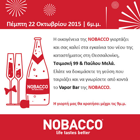 Εγκαινιάζει και επίσημα η NOBACCO ένα νέο κατάστημα στην καρδιά της εμπορικής Θεσσαλονίκης. Την Πέμπτη 22 Οκτωβρίου στις 6μμ, στην οδό Τσιμισκή 99 και Παύλου Μελά, ένα πάρτυ περιμένει τους Θεσσαλονικείς, και όλους όσους θέλουν δοκιμάσουν τις μοναδικές γεύσεις και αρώματα που προσφέρει η NOBACCO.