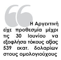 Aξίζει να σημειωθεί ότι η Αργεντινή είχε προθεσμία μέχρι τις 30 Ιουνίου να εξοφλήσει τόκους αξίας 539 εκατ. δολαρίων στους ομολογιούχους που είχαν συμμετάσχει στην αναδιάρθρωση του χρέους της το 2005 και το 2010. Η Αργεντινή κατέθεσε το ποσό αυτό στην Bank of New York Mellon, που διαχειρίζεται τα αναδιαρθρωμένα ομόλογα, τον Ιούνιο, ωστόσο η πληρωμή των ομολογιούχων “πάγωσε” όταν αμερικανικό δικαστήριο αποφάνθηκε πως η Αργεντινή οφείλει να πληρώσει και περίπου 1,33 δισ. δολάρια στους ομολογιούχους που δεν συμμετείχαν στην αναδιάθρωση (στους λεγόμενους holdout investors ή κατά κόσμον hedge funds-“όρνεα”).
