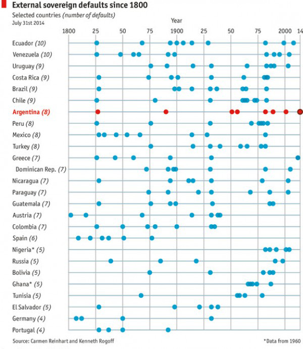 Μια εντυπωσιακή ανάλυση για τις πιο χρεοκοπημένες χώρες του κόσμου από το 1800 και μετά κάνει το περιοδικό Economist με αφορμή τις εξελίξεις στην Αργεντινή. Η Ελλάδα βρίσκεται στις πρώτες θέσεις της λίστας με τις χώρες που έχουν χρεοκοπήσει τις περισσότερες φορές αν και οι συντάκτες του περιοδικού τονίζουν ότι έχει καταφέρει να πετύχει δυναμική επιστροφή στις αγορές, μέσα σε δύο χρόνια.