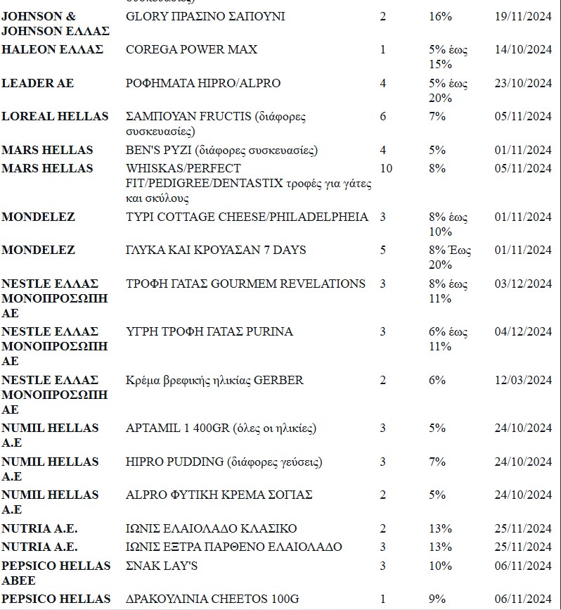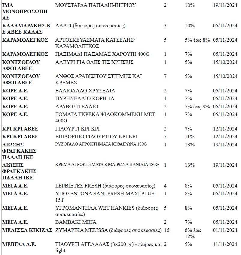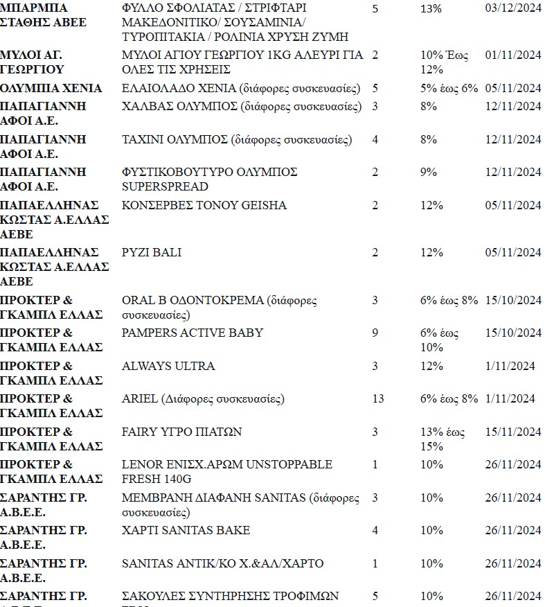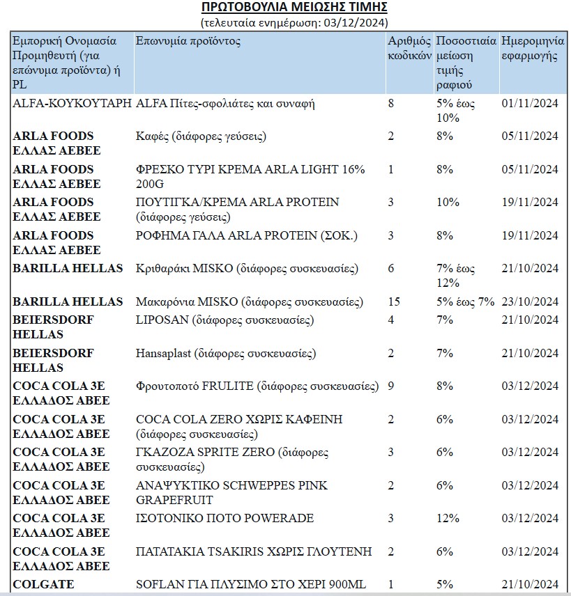 Στη νέα λίστα, συμπεριλαμβάνεται η ημερομηνία έναρξης εφαρμογής της μειωμένης τιμής, διευκολύνοντας έτσι τους καταναλωτές στις επιλογές τους.
