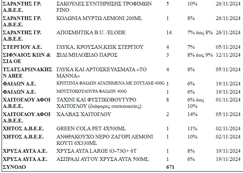 Λίστα με τους 671 κωδικούς προϊόντων που έχουν ενταχθεί έως τώρα στην πρωτοβουλία μείωσης τιμών στα σούπερ μάρκετ από 5% έως 24% ανακοίνωσε σήμερα το Υπουργείο Ανάπτυξης.