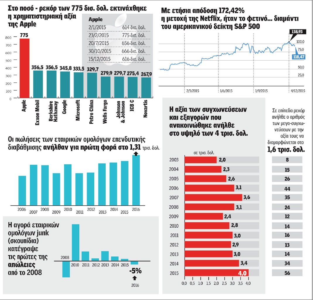 Η χρονιά των ρεκόρ, τόσο θετικών όσο και αρνητικών, ήταν στο πεδίο της οικονομίας το 2015. Λίγες μόλις ημέρες πριν από τη λήξη του έτους, το πρακτορείο ειδήσεων Bloomberg κατάφερε να συνοψίσει σε αριθμούς όλες τις σημαντικές εξελίξεις του επενδυτικού και οικονομικού κόσμου, ιεραρχώντας πρώτη το ιστορικό υψηλό των 775 δισ. δολαρίων που έφθασε η κεφαλαιοποίηση της Apple.
