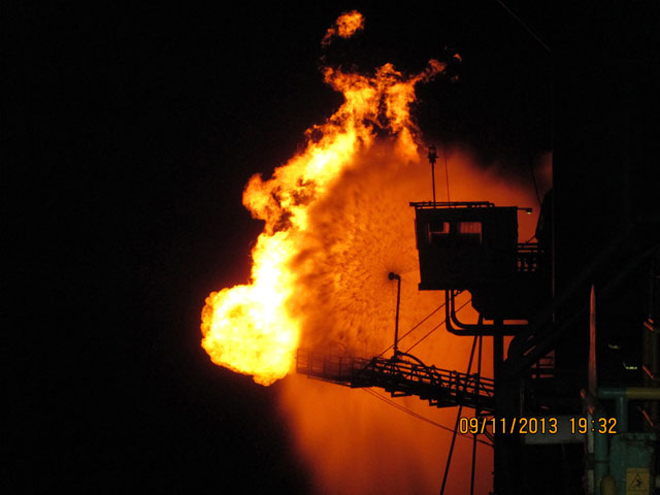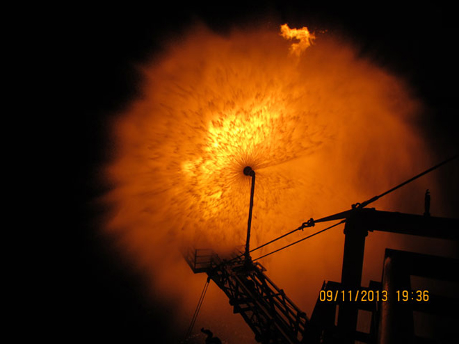 Οι φωτογραφίες τραβήχθηκαν πάνω από την πλατφόρμα/γεωτρύπανο «ENSCO 506» και αφορούν την καύση αερίου χθες αργά το απόγευμα. Η φλόγα θα παραμείνει έτσι και στη συνέχεια, αφού τα τεστ για τη ροή του αερίου έχουν ολοκληρωθεί.