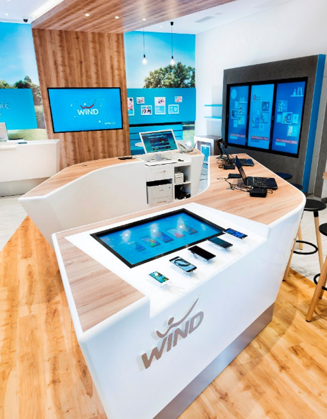 Στα νέα καταστήματα WIND ο λειτουργικός σχεδιασμός και η τεχνολογία συναντούν την υψηλή αισθητική. Μέσα από διαδραστικές οθόνες αφής και το ειδικό λογισμικό που έχει δημιουργήσει η WIND, ο επισκέπτης εξερευνά και προσωποποιεί τις επιλογές του στην κινητή, τη σταθερή και το Internet σε κάθε πιθανό συνδυασμό ή συγκρίνει live τις συσκευές που τον ενδιαφέρουν. Μια καινοτομία που παρουσιάζεται για πρώτη φορά στην Ελληνική Αγορά. Παράλληλα κάθε σημείο του καταστήματος φιλοξενεί smartphones και tablets τελευταίας τεχνολογίας ώστε ο επισκέπτης να τα ανακαλύψει ζωντανά την ίδια στιγμή, να πλοηγηθεί και να τα συγκρίνει.