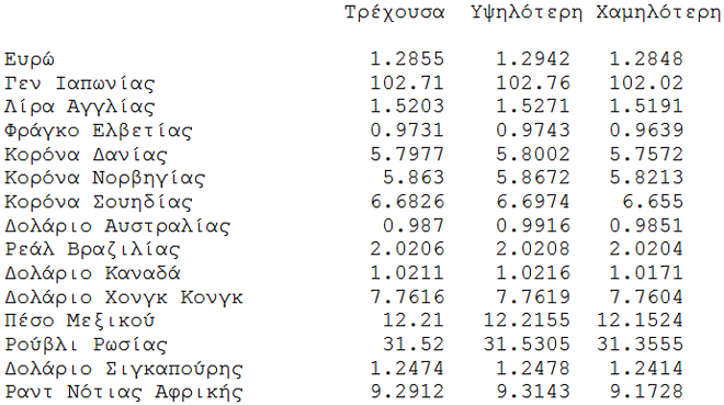 Οι ισοτιμίες των ξένων νομισμάτων έναντι του δολαρίου διαμορφώθηκαν στις 15:00 (ώρα Ελλάδας) στο Λονδίνο ως εξής...