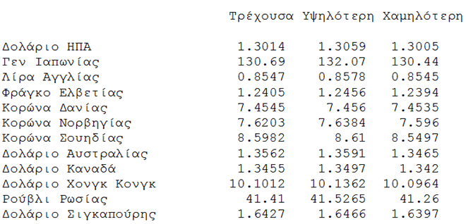 Οι ισοτιμίες των ξένων νομισμάτων έναντι του ευρώ είχαν διαμορφωθεί στις 12.00 (ώρα Ελλάδας) στο Λονδίνο ως εξής...