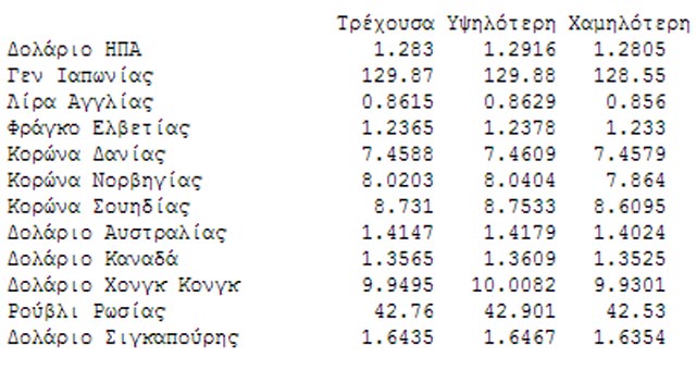 Οι ισοτιμίες των ξένων νομισμάτων έναντι του ευρώ είχαν διαμορφωθεί στις 24:00 (ώρα Ελλάδας) στο Λονδίνο ως εξής: