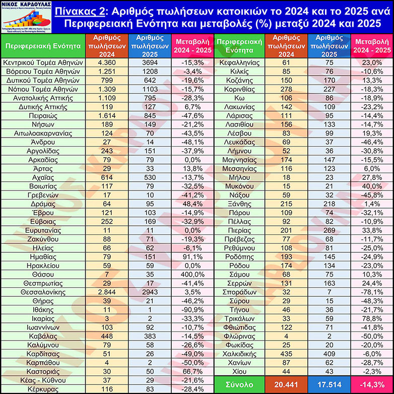 Στον πίνακα 2 που ακολουθεί απεικονίζονται οι αριθμοί πωλήσεων κατοικιών ανά ΠΕ για το 2024 και το 2025, στις οποίες δεν περιλαμβάνονται οι κατοικίες από γονική παροχή ή δωρεά Α΄, Β΄ και Γ΄ κατηγορίας και η σχετική μεταβολή (%) μεταξύ των δύο ετών για όλες τις ΠΕ της χώρας.