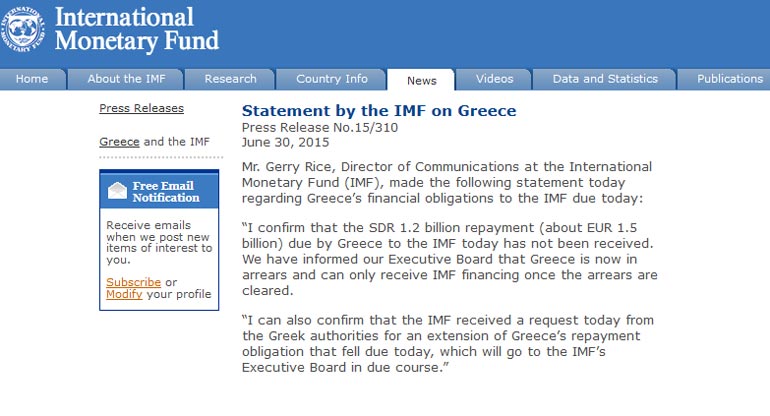 «Μία οικονομική καταστροφή μόλις συνέβη. Η πληρωμή των 1,6 δις ευρώ δεν έγινε» ανέφερε πριν από λίγο ο Richard Quest του CNN. Πρόκειται για το μεγαλύτερο «φέσι» που έχει φορέσει ποτέ ανεπτυγμένη χώρα στο ΔΝΤ, σημαίνοντας ότι η χώρα μπαίνει σε ένα είδος «Τειρεσία» που την αποκλείει από την άντληση χρηματοδότησης από διεθνείς αγορές ή οργανισμούς όπως το ΔΝΤ.
