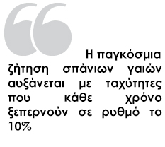 Η παγκόσμια ζήτηση σπάνιων γαιών αυξάνεται με ταχύτητες που κάθε χρόνο ξεπερνούν σε ρυθμό το 10%. Μάλιστα, μέσα σε μια μόλις δεκαετία, από τους 40.000 τόνους εκτοξεύτηκε στους 120.000 ετησίως, ενώ σύμφωνα με τα επίσημα στοιχεία του υπουργείου Περιβάλλοντος, την τελευταία πενταετία η ζήτηση αυξήθηκε κατά περίπου 55%. Οικονομικοί αναλυτές, εκτιμούν πως η αμερικανική, η ιαπωνική και η ευρωπαϊκή βιομηχανία δεν μπορούν να συνεχίζουν να υπάρχουν δίχως τις σπάνιες γαίες.