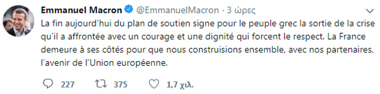 Το «κουράγιο» και την «αξιοπρέπεια» του ελληνικού λαού κατά τη διάρκεια της οικονομικής κρίσης χαιρέτισε με μήνυμά του στο Twitter ο πρόεδρος της Γαλλίας Εμανουέλ Μακρόν, με την ευκαιρία της εξόδου της Ελλάδας από τα μνημόνια.