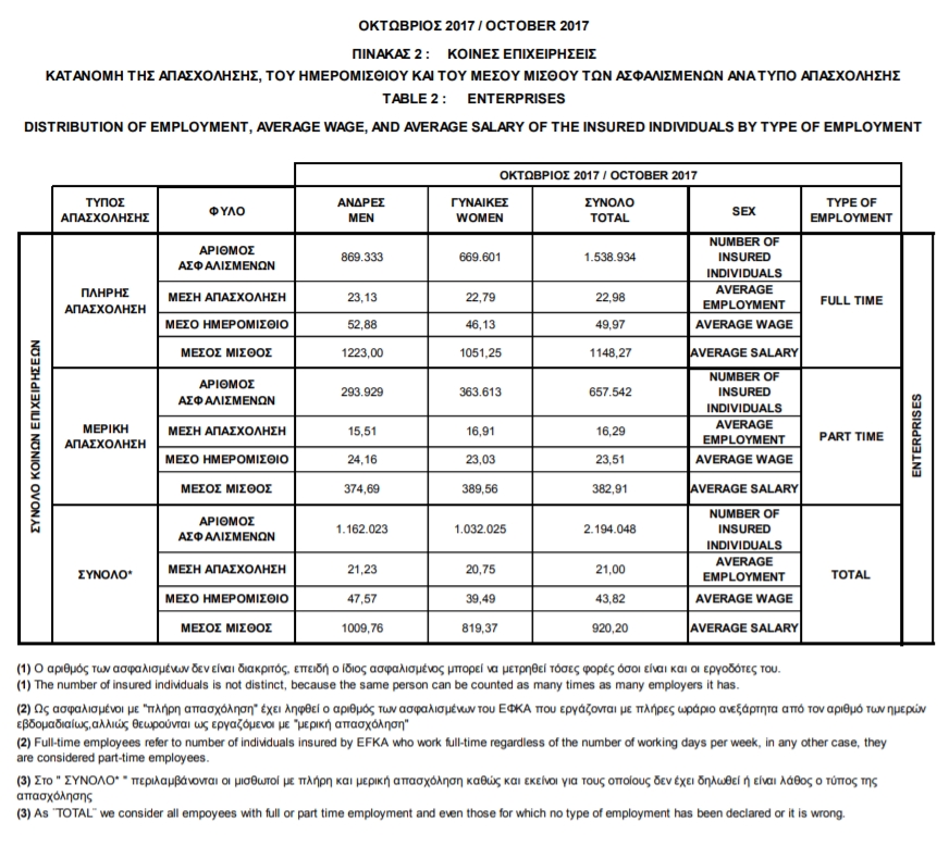 Συγκριτικά με το Σεπτέμβριο του 2017, τον Οκτώβριο ο αριθμός των ασφαλισμένων στις κοινές επιχειρήσεις μειώθηκε κατά 2,24%, στα οικοδομοτεχνικά έργα αυξήθηκε κατά 6,76% και στο σύνολο των επιχειρήσεων μειώθηκε κατά 2,09%. Η μέση απασχόληση στις κοινές επιχειρήσεις μειώθηκε κατά 0,99%, στα οικοδομοτεχνικά έργα αυξήθηκε κατά 0,97% και στο σύνολο των επιχειρήσεων μειώθηκε κατά 1%. To μέσο ημερομίσθιο στις κοινές επιχειρήσεις αυξήθηκε κατά 1,36% και στα οικοδομοτεχνικά έργα μειώθηκε κατά 0,40%. Ο μέσος μισθός στις κοινές επιχειρήσεις αυξήθηκε κατά 0,38% και στα οικοδομοτεχνικά έργα αυξήθηκε κατά 0,56%.