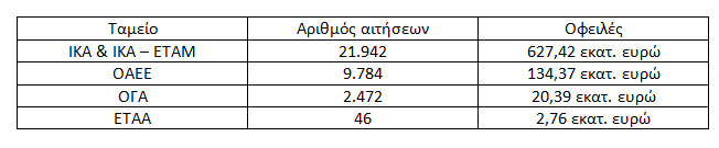 Σύμφωνα με δημοσίευμα της εφημερίδας «Η Καθημερινή», εκδόθηκαν 34.244 νέες αποφάσεις υπαγωγής για οφειλές προς τα ταμεία συνολικού ύψους 784.938.440,05 ευρώ.