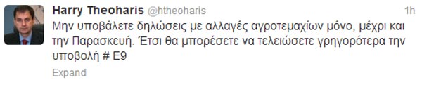 Έκκληση μέσω Twitter απηύθυνε σήμερα το πρωί στους φορολογουμένους ο γενικός γραμματέας Δημοσίων Εσόδων, Χάρης Θεοχάρης, να ξεκινήσουν την υποβολή Ε9 για τα αγροτεμάχια μετά τις 20 Σεπτεμβρίου, οπότε και θα ολοκληρωθεί η διαδικασία με τις δηλώσεις στοιχείων ακινήτων για όσους είχαν μεταβολές στην περιουσιακή τους κατάσταση το 2012.