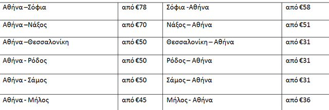 Αναλυτικά, η διαμόρφωση των τιμών καταγράφεται στον ακόλουθο πίνακα (όλες οι παρακάτω τιμές ισχύουν για περιορισμένο αριθμό θέσεων, αφορούν απλή διαδρομή και περιλαμβάνουν φόρους αεροδρομίων και τις αντίστοιχες χρεώσεις συναλλαγής ανά επιβάτη, για κρατήσεις από την εταιρική ιστοσελίδα www.olympicair.com):