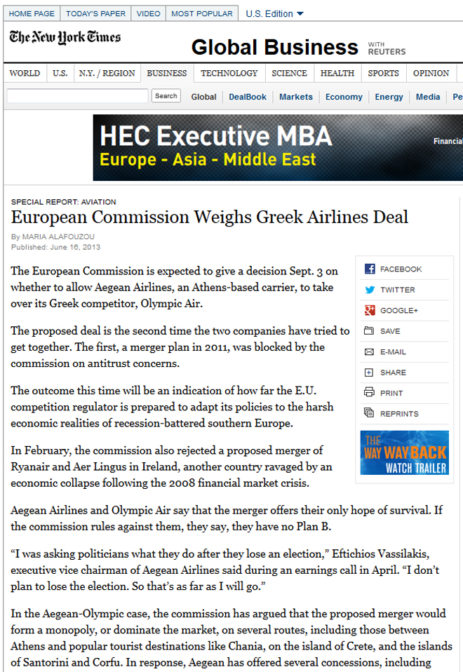 Για ορισμένους, το γεγονός ότι η Ευρώπη διανύει το πέμπτο έτος οικονομικής κρίσης δικαιολογεί μια χαλάρωση των ρυθμίσεων της Ε.Ε. σε θέματα ανταγωνισμού που θα δώσει στις δοκιμαζόμενες ευρωπαϊκές αεροπορικές μια ευκαιρία να επιβιώσουν. «Δεδομένης της κατάστασης της ελληνικής οικονομίας και της σημασίας του τουρισμού, ο ανταγωνισμός μεταξύ των δύο αεροπορικών είναι αυτή τη στιγμή κάτι σαν πολυτέλεια» αναφέρει ο John Strickland, διευθυντής της JLS Consulting στο Λονδίνο.