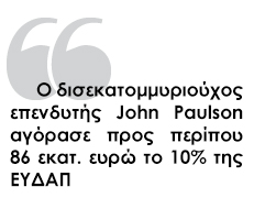 Ωστόσο, τα γεγονότα φαίνεται -τουλάχιστον για την ώρα- να διαψεύδουν τον Αμερικανό κροίσο, ο οποίος μοιάζει να έχει αλλάξει ρότα, αφού την Τετάρτη αγόρασε, προς περίπου 86 εκατομμύρια ευρώ, το 10% της ΕΥΔΑΠ από την Τράπεζα Πειραιώς.