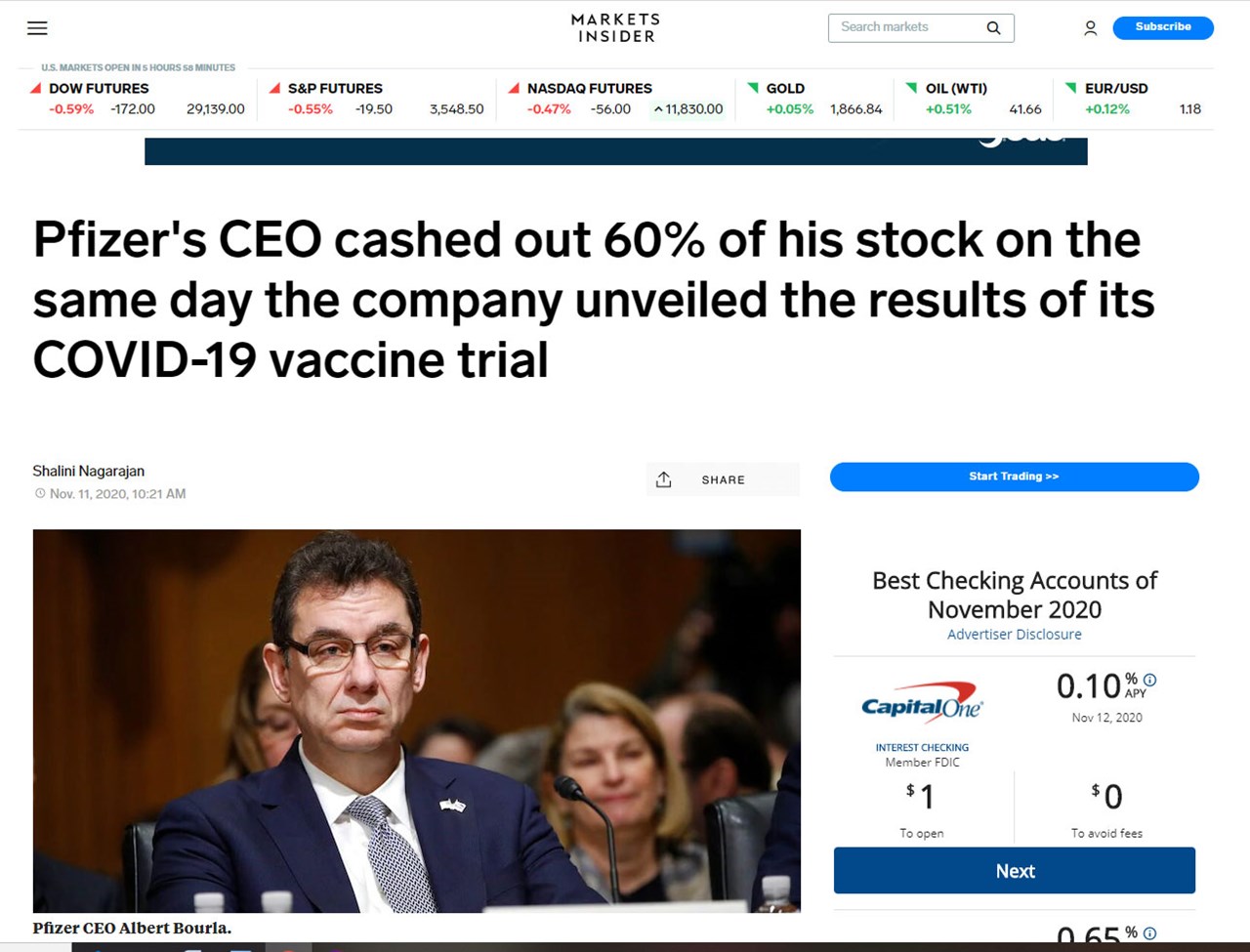 Ειδικότερα, όπως μεταδίδει το Business Insider, αμέσως μετά τις ανακοινώσεις για την επιτυχία του εμβολίου σε ποσοστό 90%, ο Μπουρλά ρευστοποίησε πάνω από το 60% των μετοχών του. Η μετοχή της Pfizer, εκείνη την ώρα, είχε «σκαρφαλώσει» κατά 16% φθάνοντας στα υψηλότερα επίπεδά της, κοντά στα 42 δολάρια.