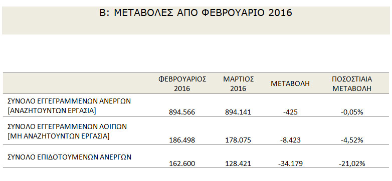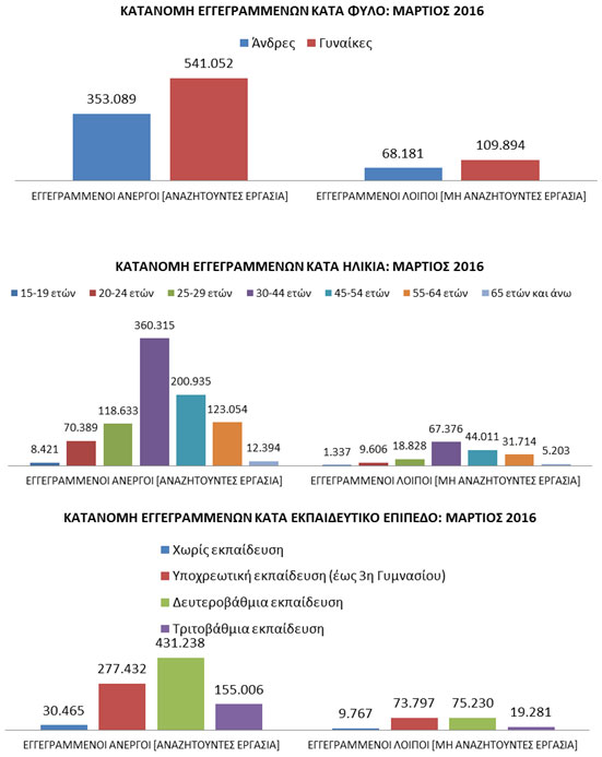 Το σύνολο των εγγεγραμμένων ανέργων, με κριτήριο την αναζήτηση εργασίας (αναζητούντων εργασία), για τον μήνα Μάρτιο 2016, ανήλθε σε 894.141 άτομα. Από αυτά 450.234 (ποσοστό 50,35%) είναι εγγεγραμμένα στο μητρώο του ΟΑΕΔ για χρονικό διάστημα ίσο ή και περισσότερο των 12 μηνών και 443.907 (ποσοστό 49,65%) είναι εγγεγραμμένα στο μητρώο του ΟΑΕΔ για χρονικό διάστημα μικρότερο των 12 μηνών. Οι άνδρες ανέρχονται σε 353.089 (ποσοστό 39,49%) και οι γυναίκες ανέρχονται σε 541.052 (ποσοστό 60,51%).