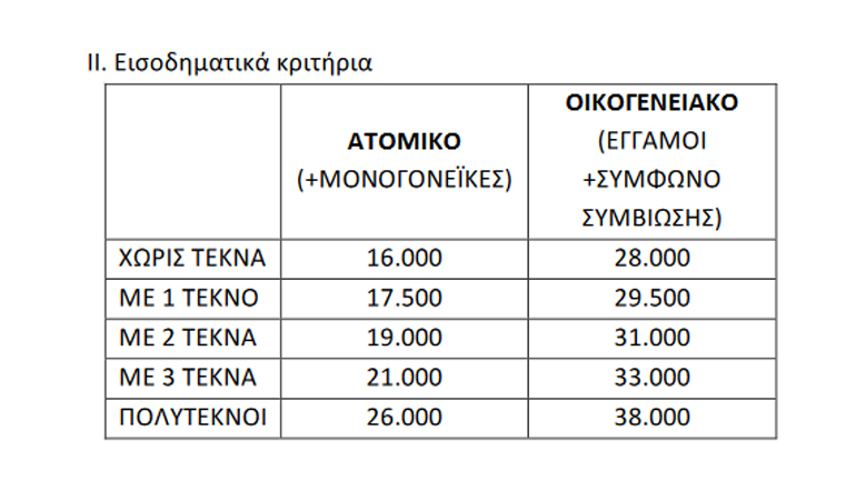 Κριτήριο για ένταξη στο πρόγραμμα είναι το ετήσιο ατομικό εισόδημα να είναι έως 16.000 ευρώ, 28.000 για οικογενειακό, συν την προσαύξηση 1.500 ευρώ ανά τέκνο.