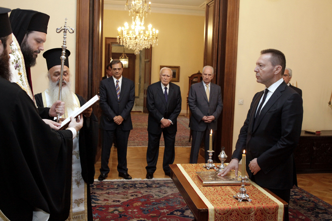 Στην ορκωμοσία χοροστάτησε ο επίσκοπος Διαυλείας Γαβριήλ, εκ μέρους του αρχιεπισκόπου Ιερώνυμου.