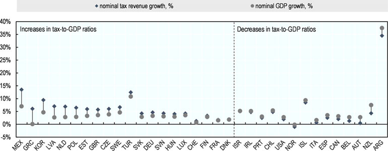 Ακόμα, σύμφωνα πάντα με τον ΟΟΣΑ, η Ελλάδα είναι η μοναδική χώρα που κατάφερε να επιβάλει τόσο μεγάλες αυξήσεις στη φορολογία, ενώ είχε μικρότερη ανάπτυξη.
